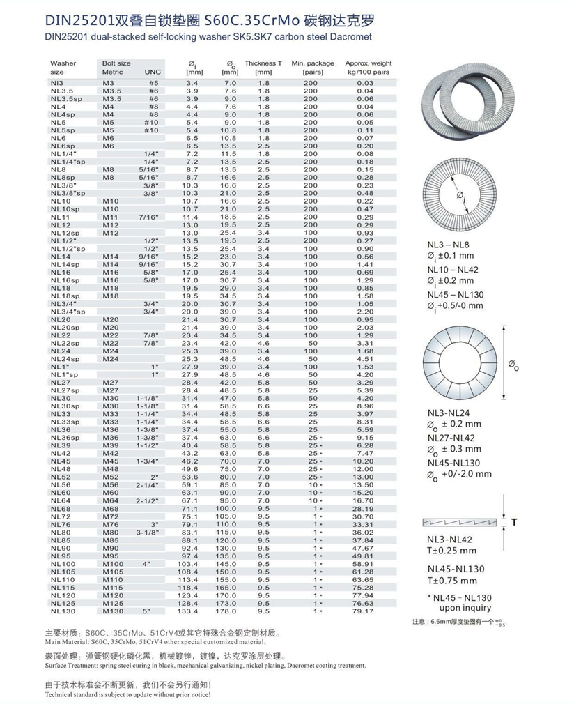 制造工藝:DIN25201標(biāo)準(zhǔn)墊圈全部使用S60C/SK5及特殊合金鋼材質(zhì)、經(jīng)過(guò)全硬化處理HRC45-52、硬度等級(jí)14.9級(jí)!