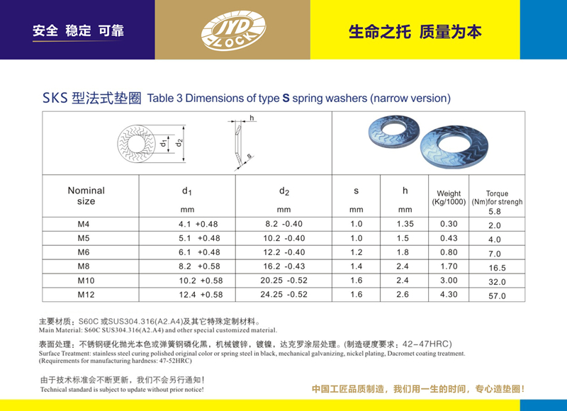 執(zhí)行標(biāo)準(zhǔn):按SKS鎖緊墊圈制造規(guī)格:M4-M30為標(biāo)準(zhǔn)型號 也可按要求求提供訂制。主要鋼質(zhì):SUS304.316、A2.A4及超級不銹鋼等 硬化等級:HV350 符合10